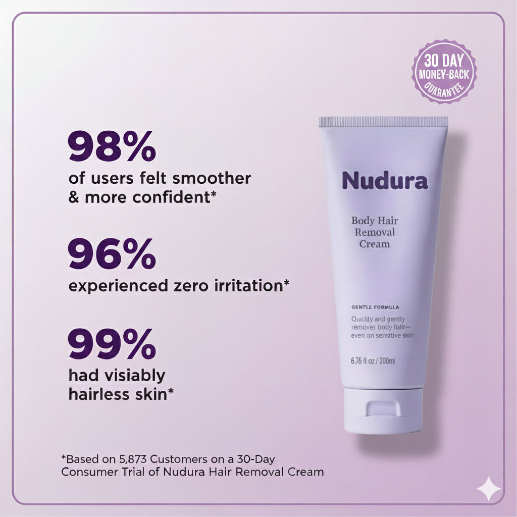 Nudura’s DermaSoft™ formula, developed with over 20 years of dermatological research, uses a gentle, science-backed blend to dissolve hair below the surface without cuts, burns, or irritation. Just one application, and you’ll enjoy irresistibly smooth skin and the confidence to look and feel your best everywhere you go.